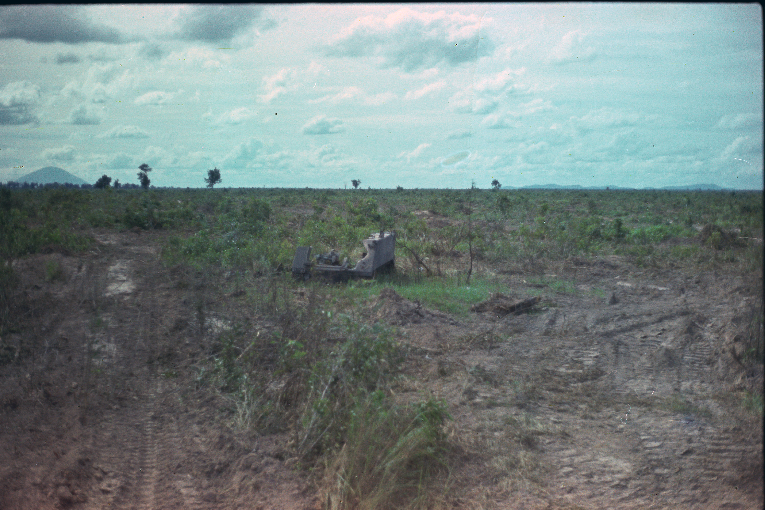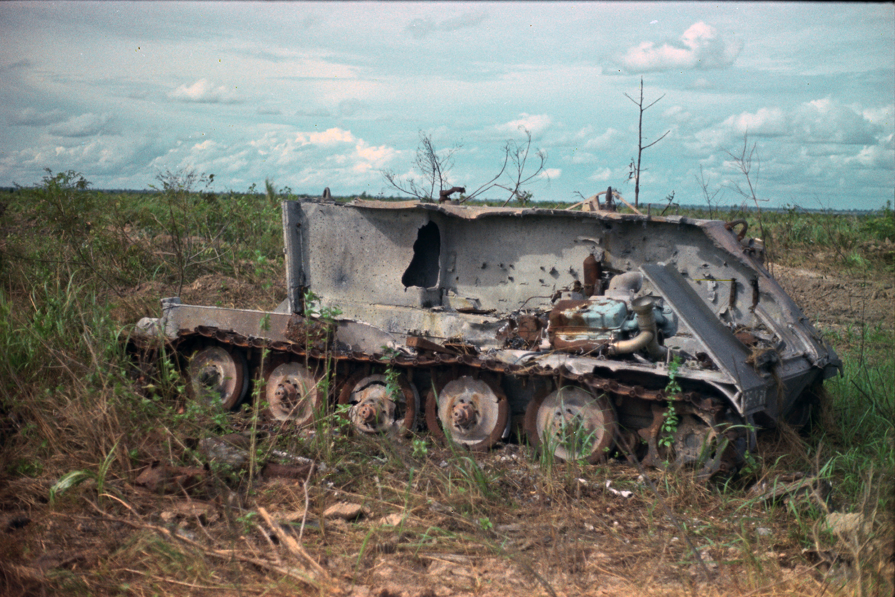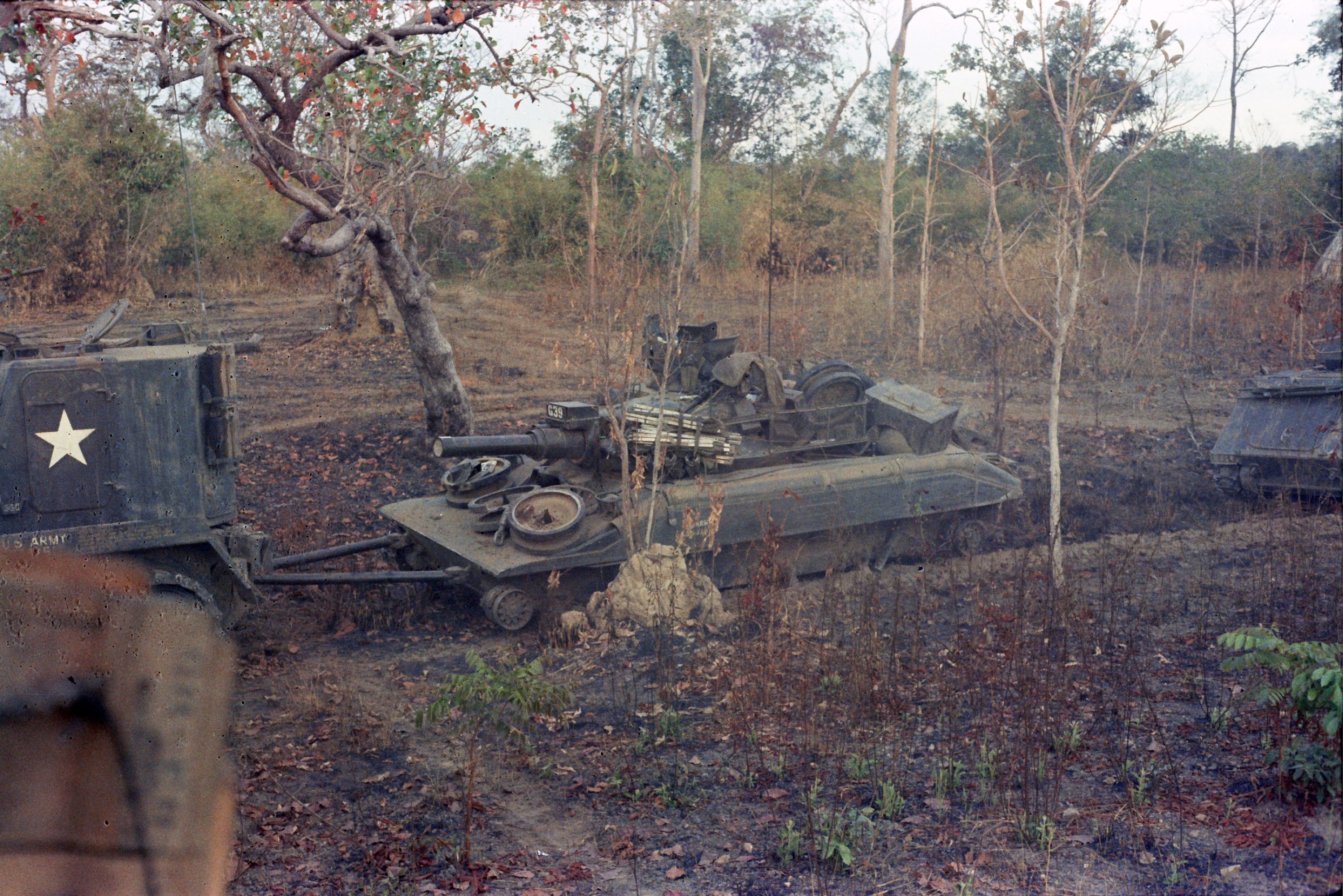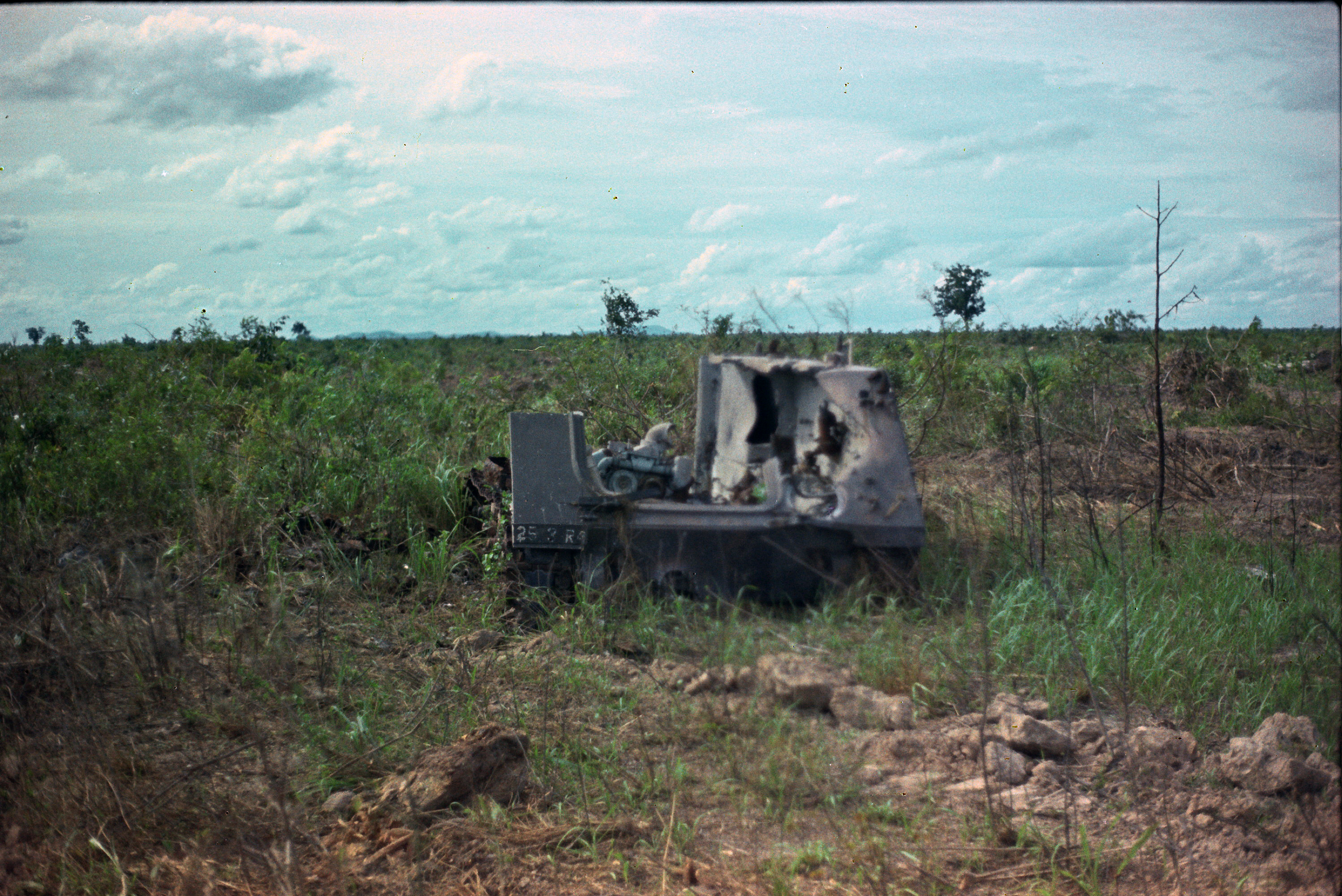 Hull of ACAV 25th infantry in Ho Bo Woods Razorbacks visible on the Horzon |