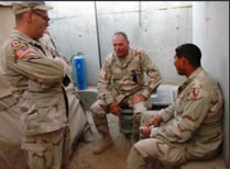 October 6th, 2005 (FOB Kalsu, Iraq)- Vietnam Veteran Jerry Williamson (center) shares combat experiences with SPC Brian Noaker (l) and 1LT Joseph Linhart (r). |