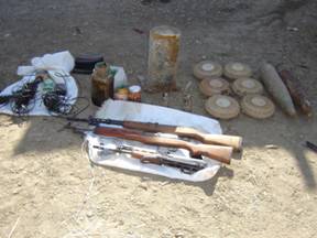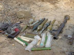 assault rifles with 12 magazines, two hand grenades, two sniper rifles, two 130-millimeter artillery rounds, a pipe bomb, one mortar tube, one RPK rifle, a 9-millimeter pistol, one