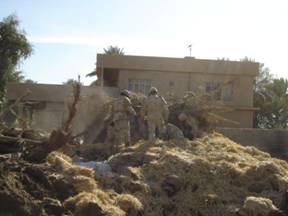 Soldiers from B Troop, 1st Squadron, 11th Cavalry search through the rubble of a chicken coop and discover a weapons cache Nov. 27. First, a small cache was found but when explosive experts destroyed the ordnance, the blast revealed an even larger stash of weapons. (U.S. Army photo) |