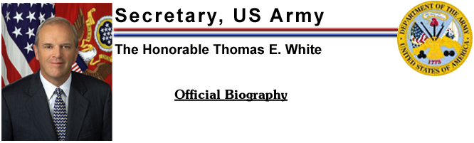 Thomas E. White became the 18th Secretary of the Army on May 31, 2001, after nomination to that post by President Bush and confirmation by the United States Senate. As Secretary of the Army, Secretary White has statutory responsibility for all matters relating to Army manpower, personnel, reserve affairs, installations, environmental issues, weapons systems and equipment acquisition, communications, and financial management. Secretary White is responsible for the department's annual budget of nearly $70 billion. The Secretary leads a work force of just over one million active duty, National Guard and Army Reserve soldiers and 270,000 civilian employees, and has stewardship over 15 million acres of land. Secretary White began his public service career as an Army officer. After graduating from the United States Military Academy at West Point, he was commissioned in the United States Army in 1967, rising to the rank of Brigadier General in 1990. His distinguished military career included two tours in Vietnam and service as Commander, 1st Squadron, 11th Armored Cavalry Regiment; Commander, 11th Armored Cavalry Regiment, V Corps; Director, Armor/Anti-Armor Special Task Force; and Executive Assistant to the Chairman, Joint Chiefs of Staff. Mr. White attended the Naval Postgraduate School, Monterey, California, and graduated in 1974 with a degree in Operations Research. In 1984, he attended The United States Army War College, Carlisle, Pennsylvania. Secretary White retired from the Army in July, 1990. From 1990 to 2001, Mr. White was employed by Enron